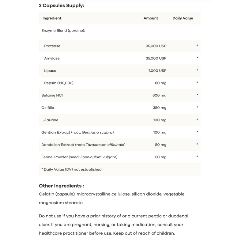 The broad-spectrum enzyme complex (protease, amylase, lipase, and pepsin) helps break down macronutrients, while Betaine HCl supports healthy stomach acidity for optimal protein digestion. Ox Bile assists with fat emulsification, and botanicals like gentian root, dandelion root, and fennel seed help soothe the digestive tract and stimulate natural enzyme secretion.