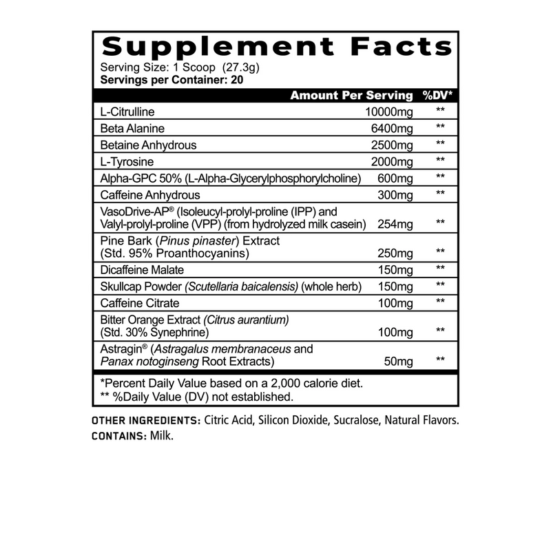 Start with 1/4 to 1/2 scoop to assess tolerance. Do not exceed 2 scoops per day. This is a very high-stimulant pre-workout and should only be used by experienced users. Avoid taking within 6 hours of bedtime.