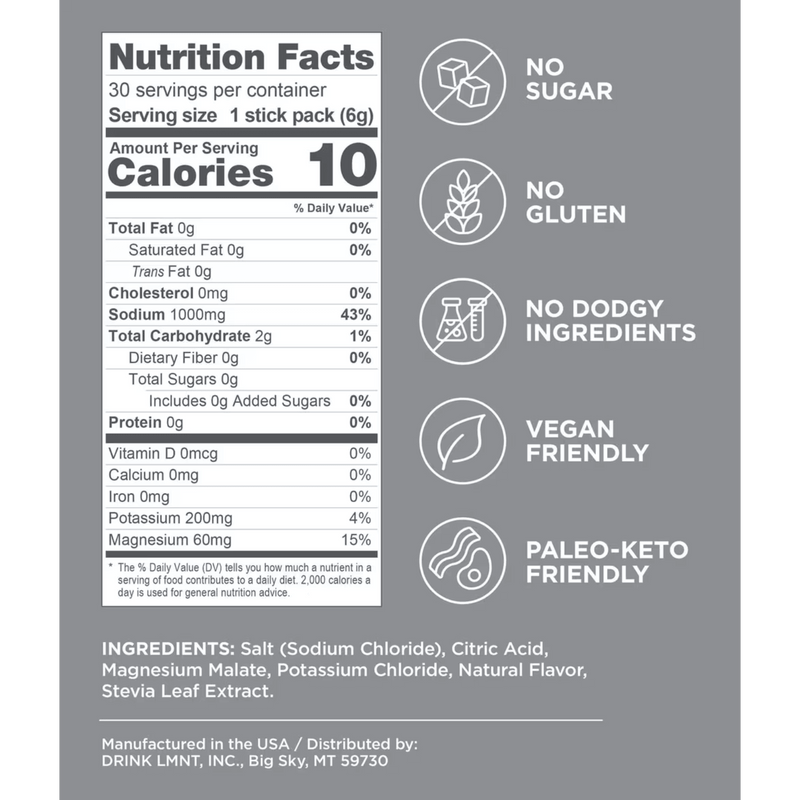 LMNT is a premium electrolyte drink mix formulated to deliver optimal hydration and performance. Each convenient stick pack contains a potent blend of 1,000 mg of sodium, 200 mg of potassium, and 60 mg of magnesium, designed by renowned biochemist and New York Times best-selling author Robb Wolf. This formulation is particularly beneficial for individuals following low-carb, keto, or paleo diets, ensuring they receive the electrolytes necessary for proper hydration and performance without any added sugars or artificial ingredients.