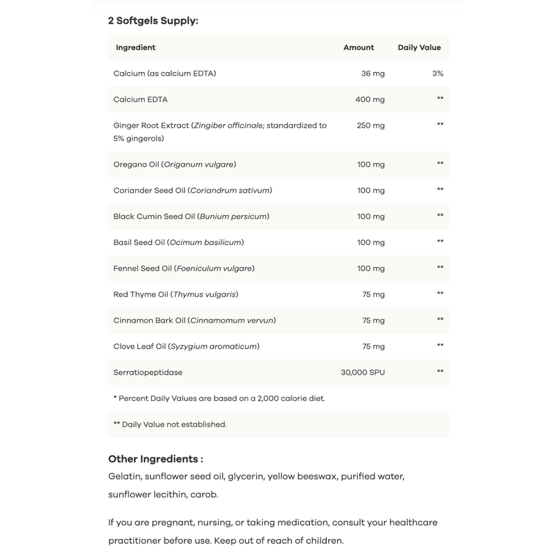 A synergistic blend of essential oils — including Oregano, Clove, Cinnamon, Thyme, Fennel, and Basil — works to maintain microbial balance while Serratiopeptidase helps break down biofilms that can protect harmful organisms. This unique combination promotes a healthy GI tract and reinforces immune function at the gut level.